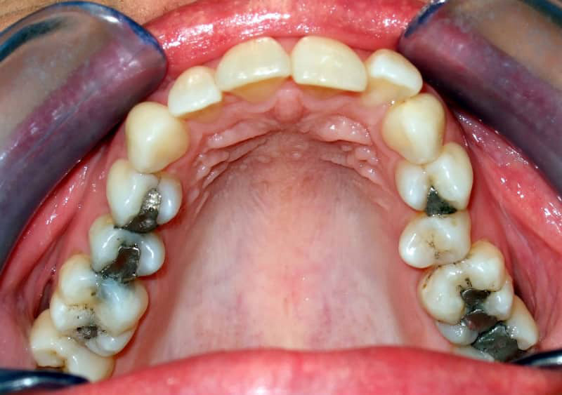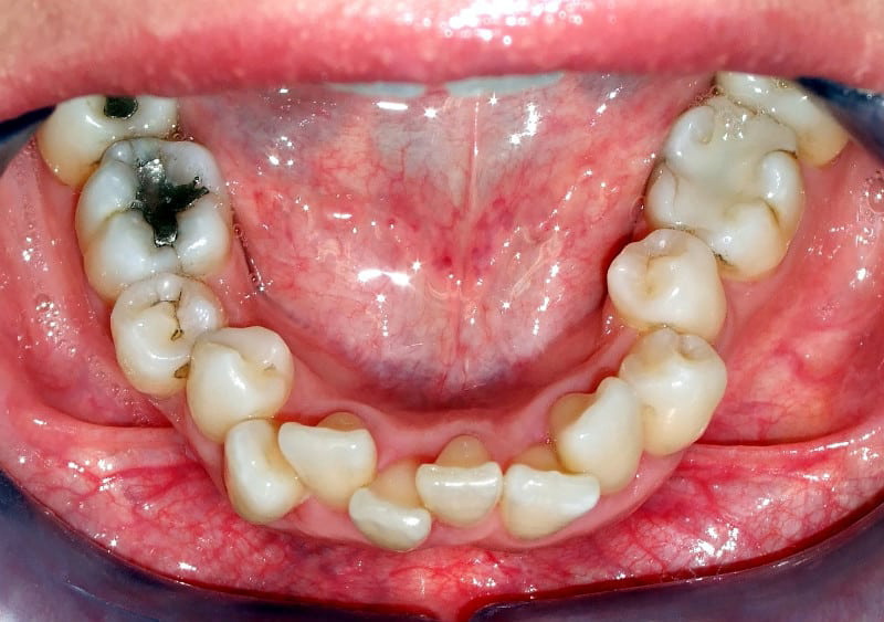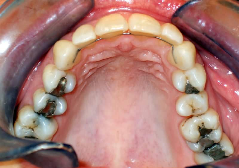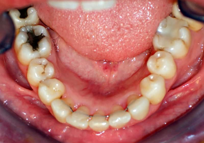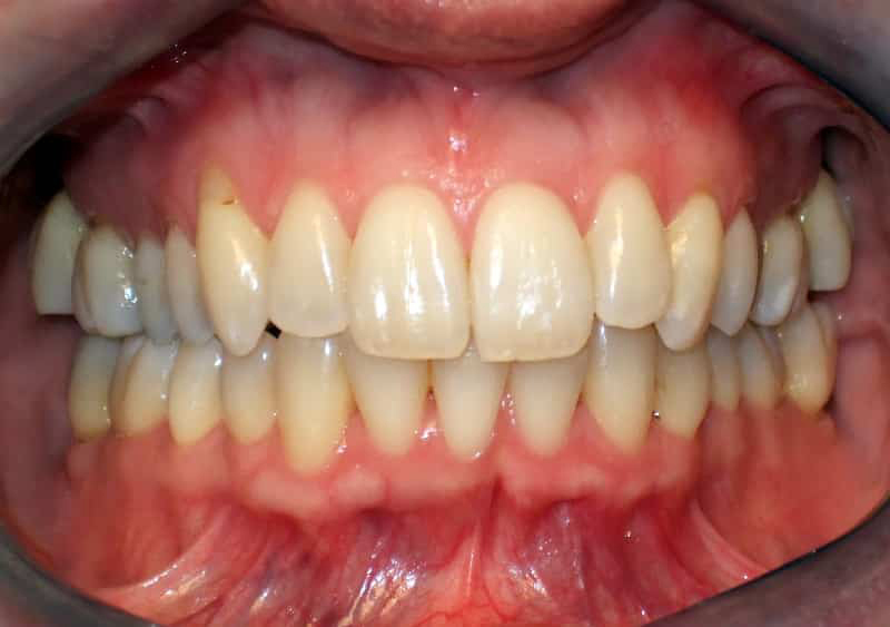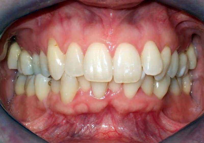 Την ασθενή απασχολούσε κατά κύριο λόγο η επιδείνωση του συνωστισμού των κάτω προσθίων δοντιών. Λόγω της καλλιτεχνικής φύσης του επαγγέλματός της, επιθυμούσε μεν να βελτιώσει και την εικόνα των προσθίων δοντιών της στην άνω γνάθο, αλλά με τον πιο σύντομο και διακριτικό τρόπο. Η θεραπεία στην οποία καταλήξαμε περιλάμβανε την τοποθέτηση ναρθήκων στην άνω γνάθο, και στην κάτω γνάθο την εξαγωγή ενός τομέα και την εφαρμογή αισθητικών ακίνητων μηχανισμών. Η διάρκεια της θεραπείας ήταν 6 μήνες για την άνω και 12 μήνες για την κάτω γνάθο, ενώ η συγκράτηση (σταθεροποίηση) έγινε με συνδυασμό ακίνητων (όπως φαίνονται στις τελικές φωτογραφίες στην εσωτερική επιφάνεια των προσθίων δοντιών) και κινητών μηχανισμών κατά τη διάρκεια του ύπνου.